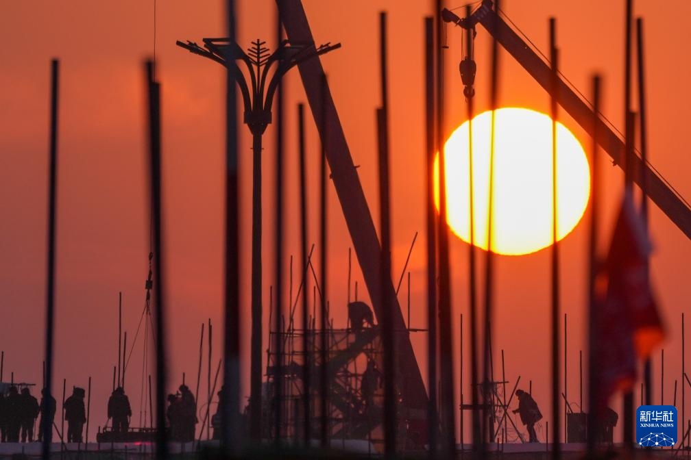 12月8日,工人在哈尔滨冰雪大世界主塔施工现场作业(无人机照片)。