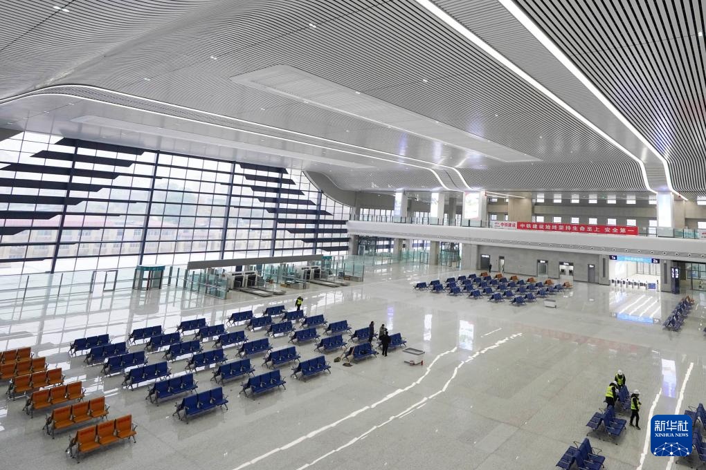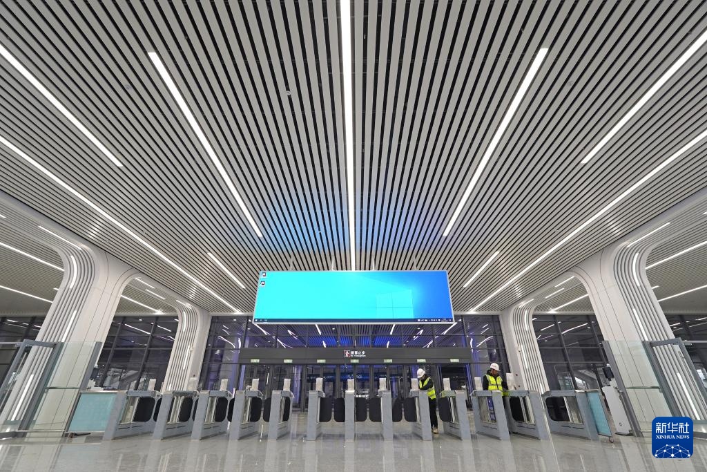 12月10日,施工人员在庐山站出站口调试闸机设备。