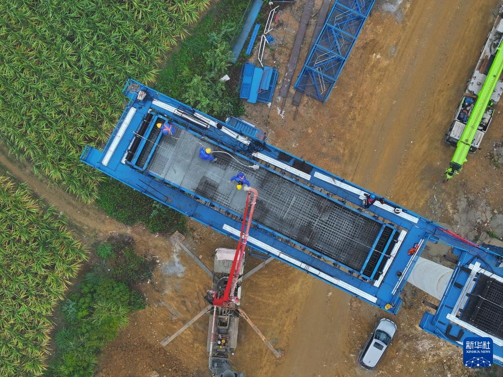 12月11日,中铁二十局工人在广西鱼宜高速公路建设工地作业(无人机照片)。