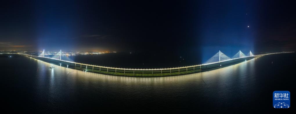 夜幕下的高栏港大桥(左侧双主塔)和黄茅海大桥(右侧三主塔)(12月4日摄,无人机全景照片)。