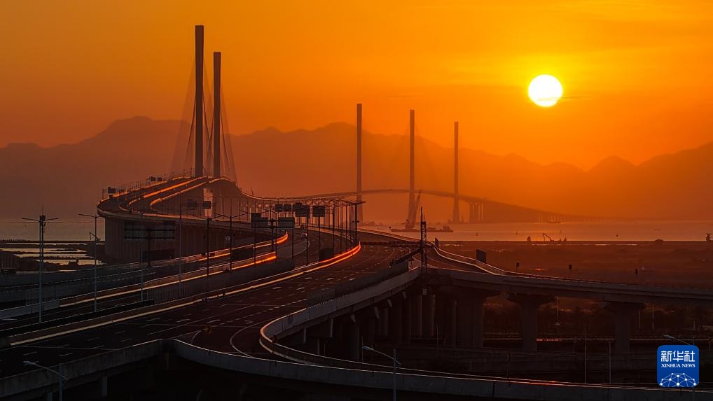 夕阳下的高栏港大桥(左侧双主塔)和黄茅海大桥(右侧三主塔)(12月4日摄,无人机照片)。