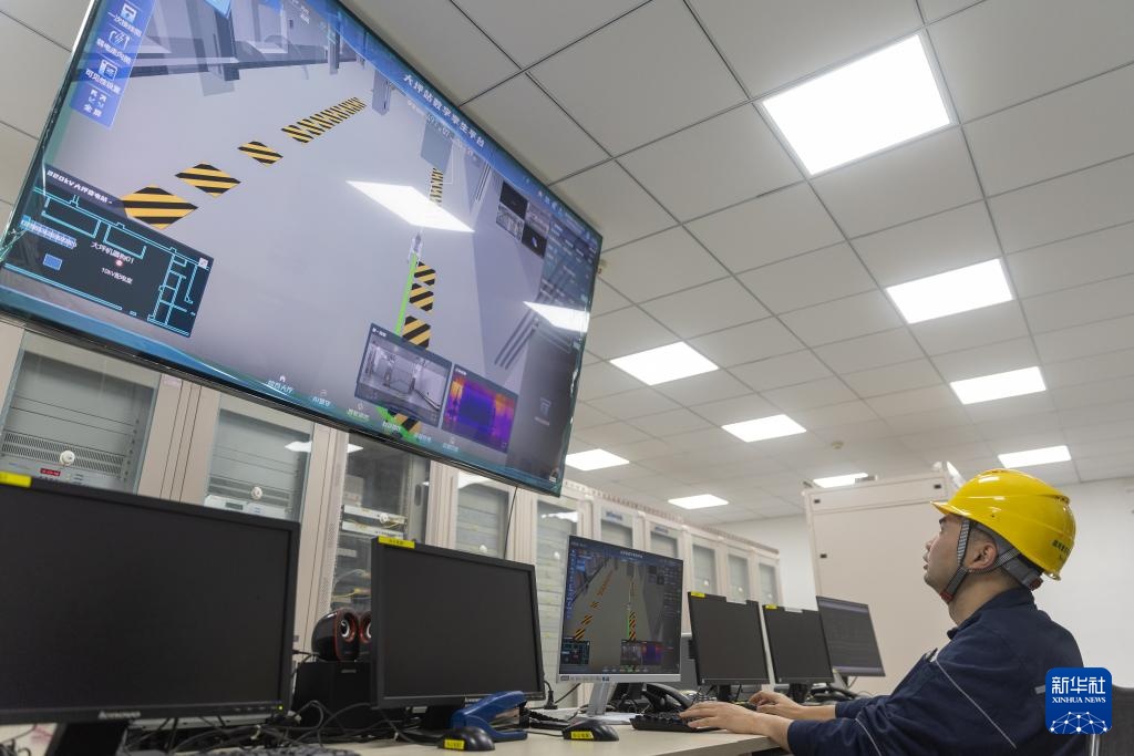 12月10日,在重庆市渝中区220千伏大坪变电站10千伏开关室,国网重庆市区供电公司的工作人员在远程智能巡视集中监控大屏上查看智能巡检机器狗实时巡视画面。