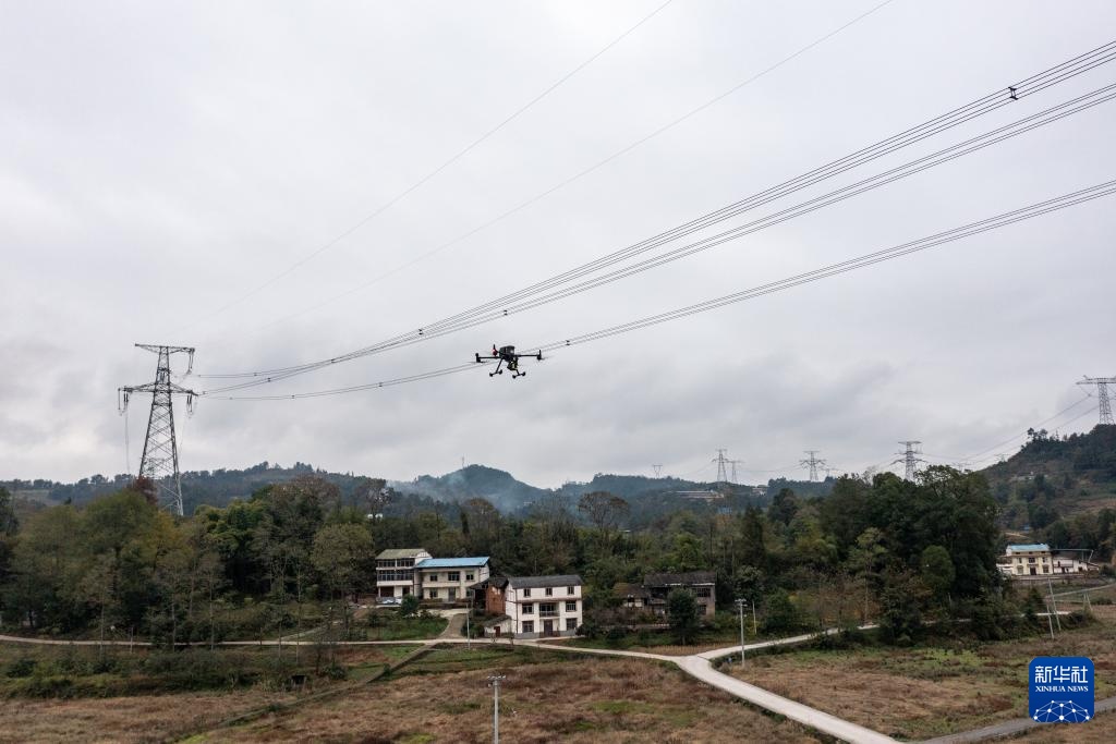 12月10日,在重庆市南川区输电线路密集通道,智能巡检无人机对输电线路进行巡视(无人机照片)。
