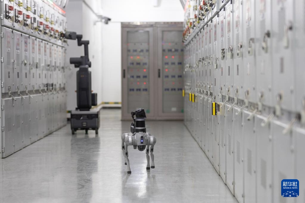 12月10日,在重庆市渝中区220千伏大坪变电站10千伏开关室,智能巡检机器狗对变电站设备运行情况进行巡视。