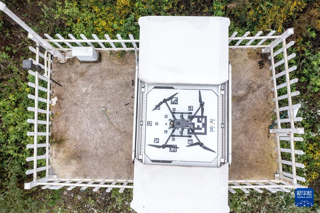 12月10日,在重庆市南川区一处智能巡检无人机巢,智能巡检无人机即将起飞对输电线路进行巡视(无人机照片)。