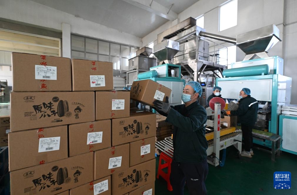 12月11日,在天津市静海区王口镇一家炒货企业,炒熟后的瓜子即将进入包装生产线。