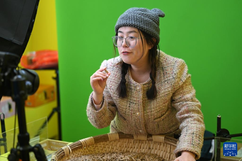 12月11日,在天津市静海区王口镇一家炒货企业,工作人员在直播间带货。