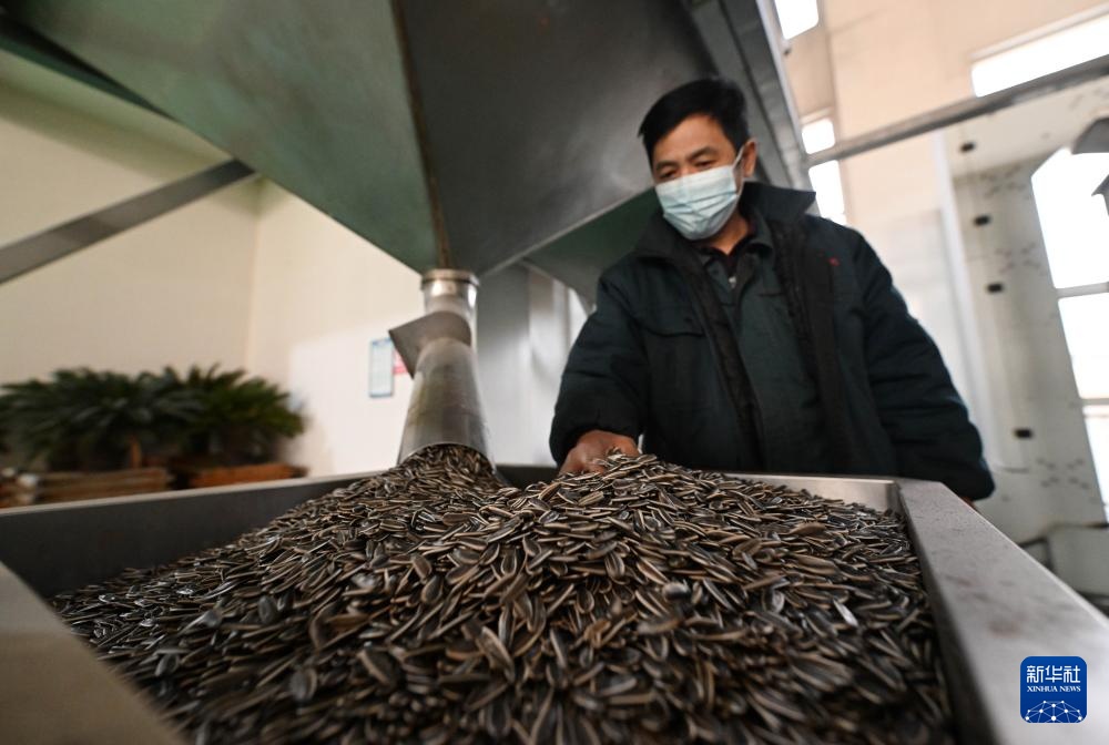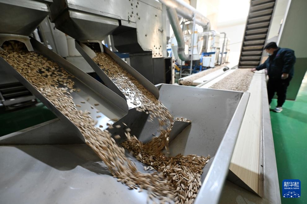 12月11日,在天津市静海区王口镇一家炒货企业,工人查看即将进入自动炒货机的生瓜子。