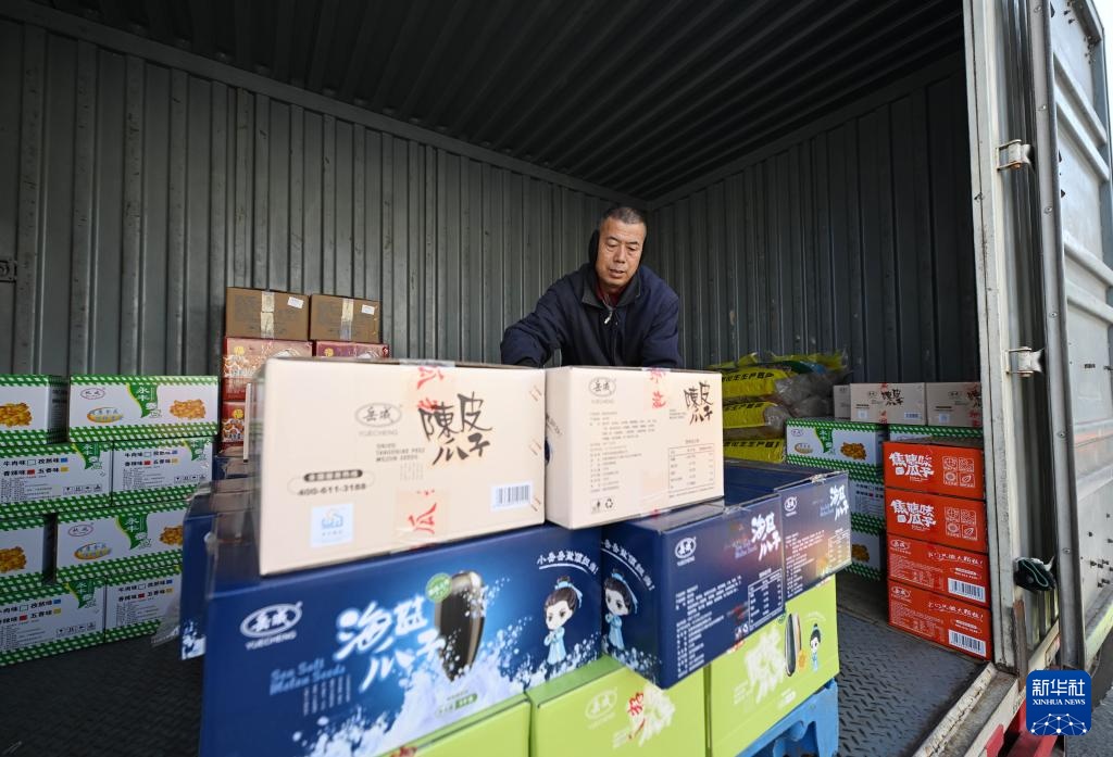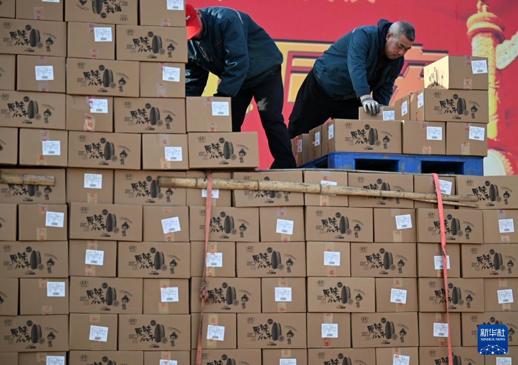 12月11日,在天津市静海区王口镇一家炒货企业,工作人员在货车上搬运成箱的瓜子。