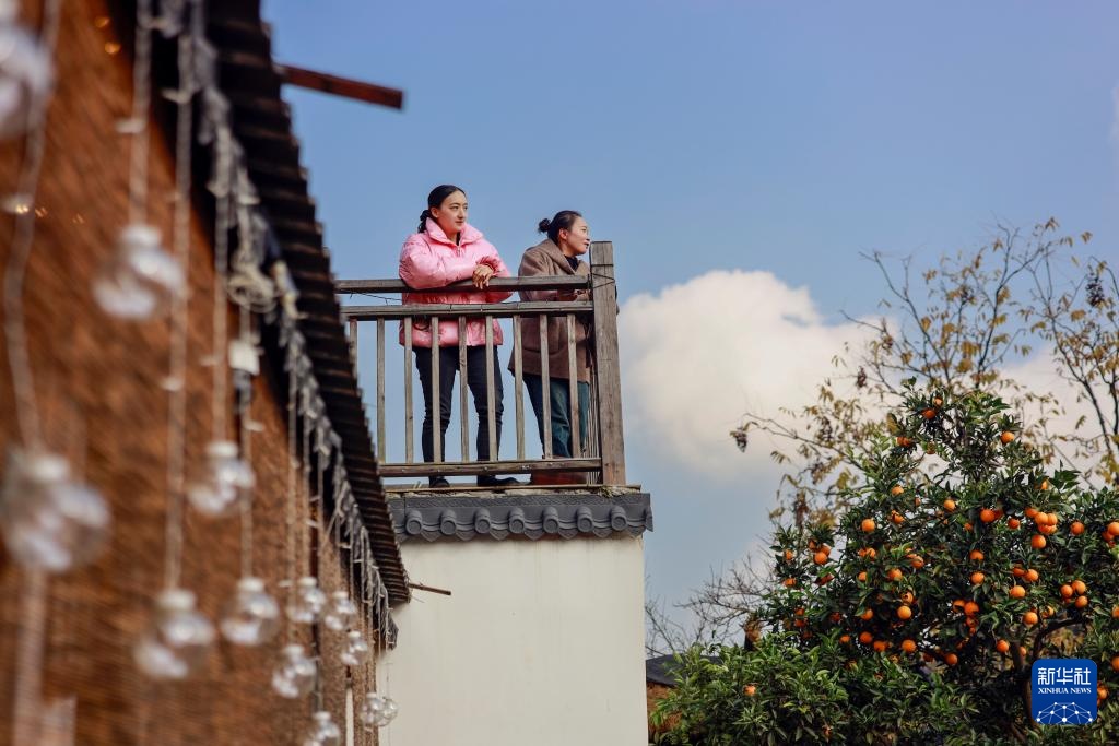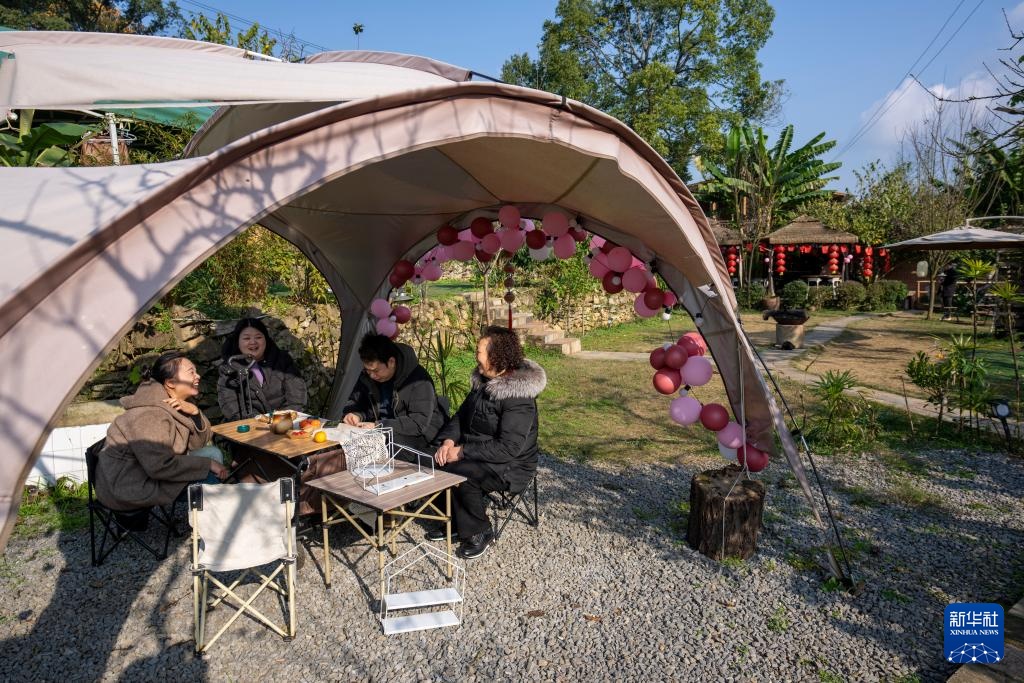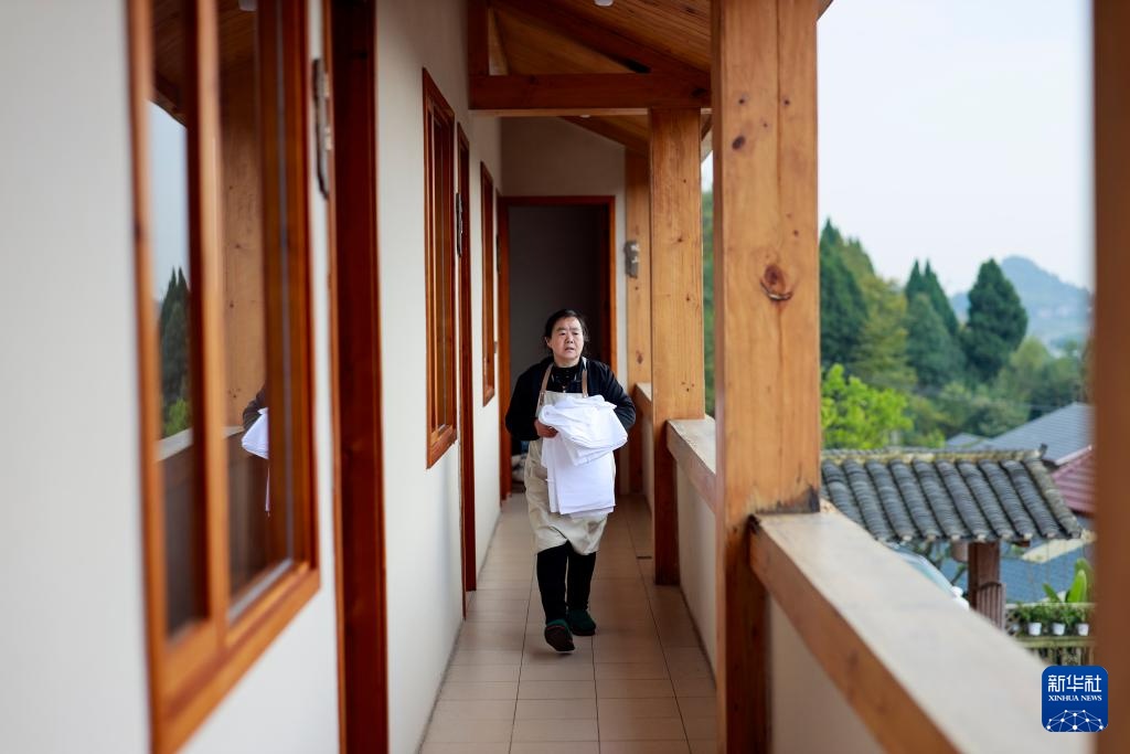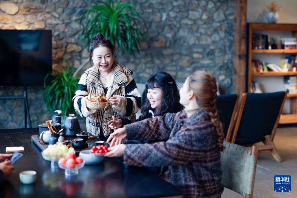 12月11日,重庆市北碚区天府镇工农村吾居无束民宿,返乡创业的民宿经营者龙正莉(左一)为游客服务。