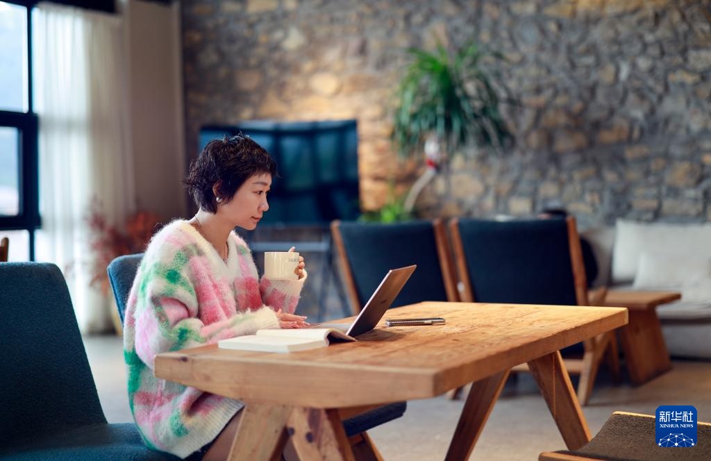 12月11日,重庆市北碚区天府镇工农村吾居无束民宿的咖啡厅内,民宿的主理人龙凤通过网络与预定的游客沟通交流。