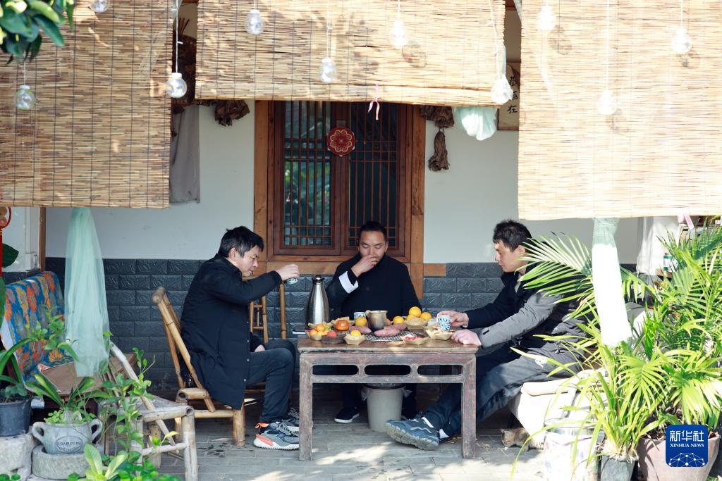 12月11日,重庆市北碚区天府镇文星村的弄泉斋民宿内,游客休闲品茗。