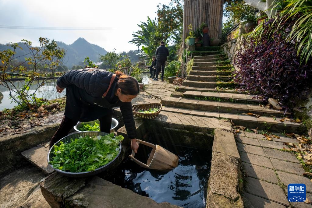 12月11日,重庆市北碚区天府镇文星村的弄泉斋民宿内,在该民宿工作的当地村民张中菊用井水洗菜。