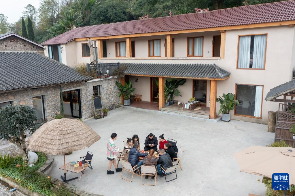 12月11日,重庆市北碚区天府镇工农村一处利用闲置农房打造的民宿院内,游客围炉煮茶(无人机照片)。