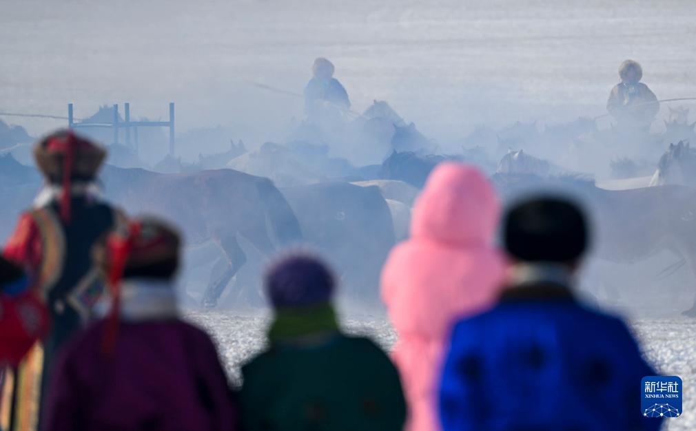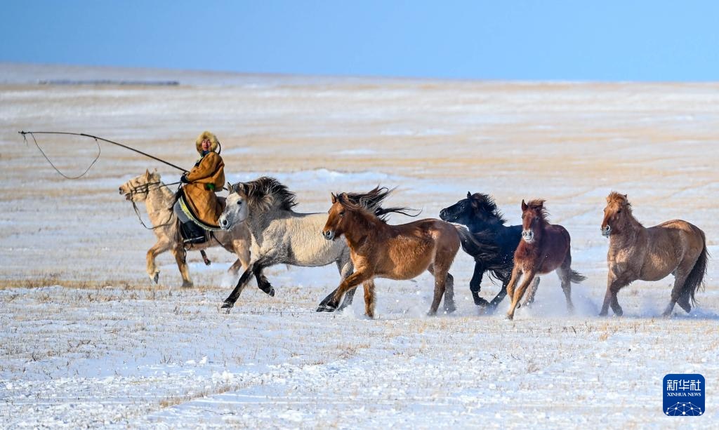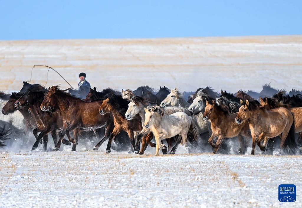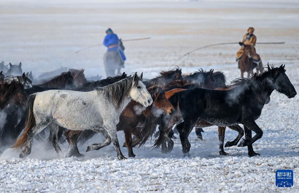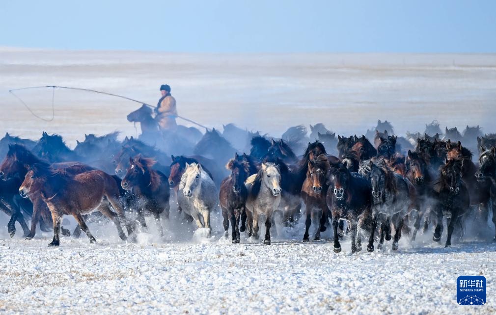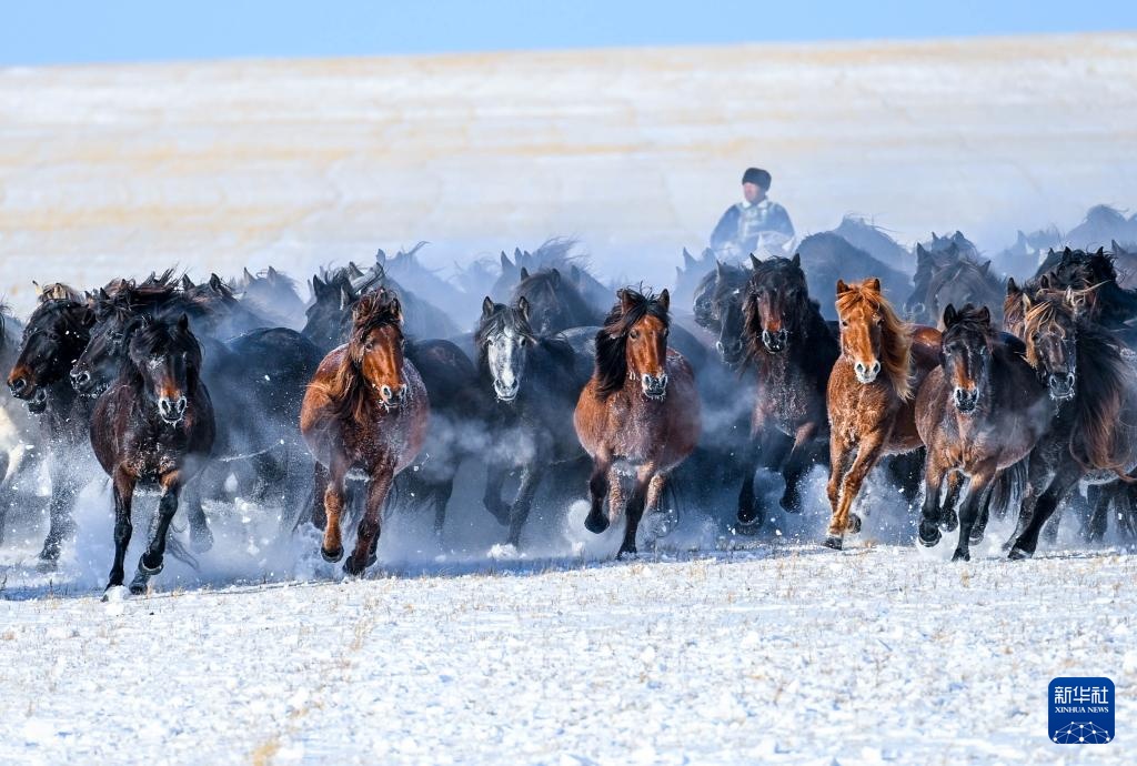 冬季内蒙古锡林郭勒盟东乌珠穆沁旗的草原被白雪覆盖。牧民赶着马群在雪原上驯马,为八方游客呈现了骏马奔腾的壮观景象。