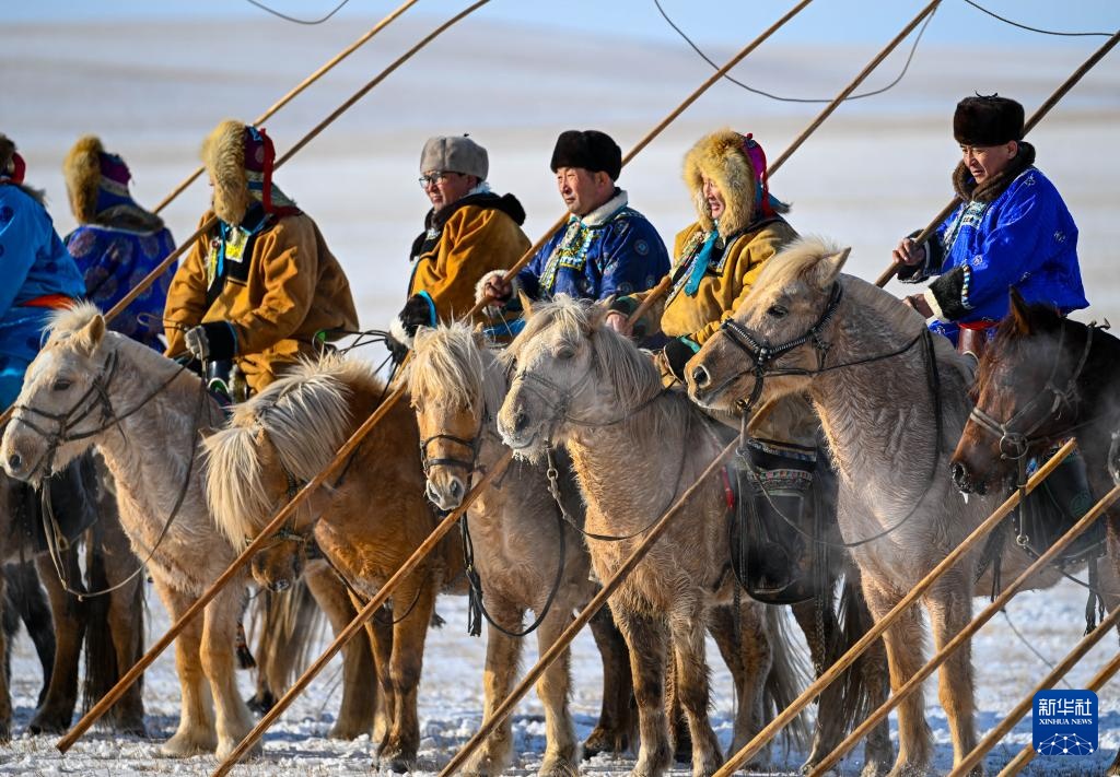 12月12日,东乌珠穆沁旗的牧民在雪原上驯马。