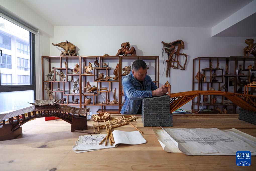 12月11日,木拱桥传统营造技艺省级代表性传承人曾家快在泰顺县泗溪镇的工作室内制作一座廊桥模型。
