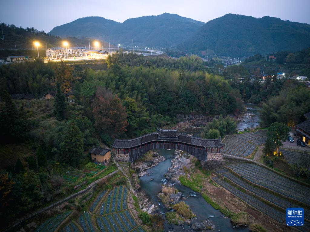 这是12月12日拍摄的夜幕下的泰顺县筱村镇文兴桥。文兴桥是一座左右不对称结构的廊桥(无人机照片)。