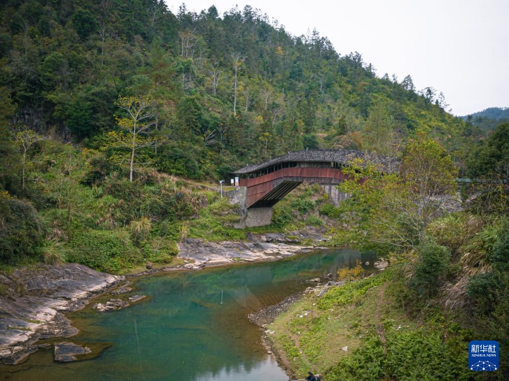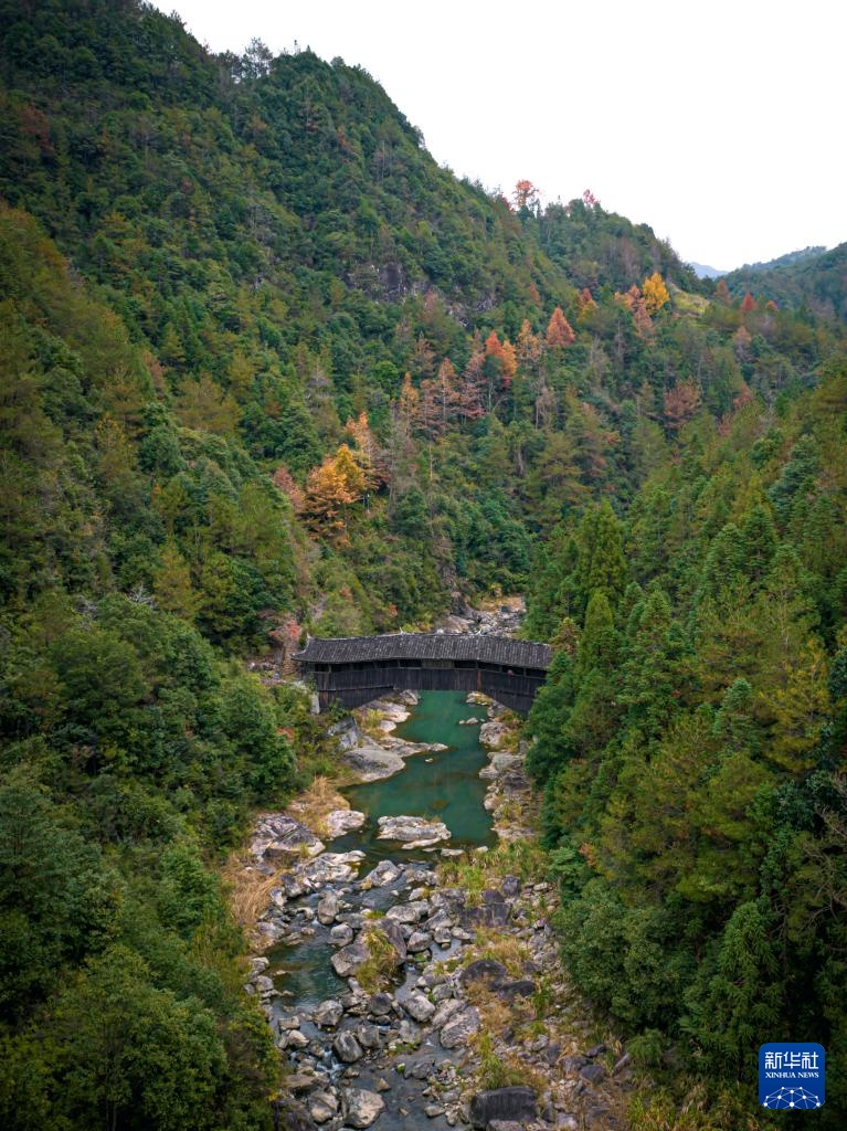12月12日拍摄的泰顺县筱村镇文兴桥,文兴桥是一座左右不对称结构的廊桥(无人机照片)。