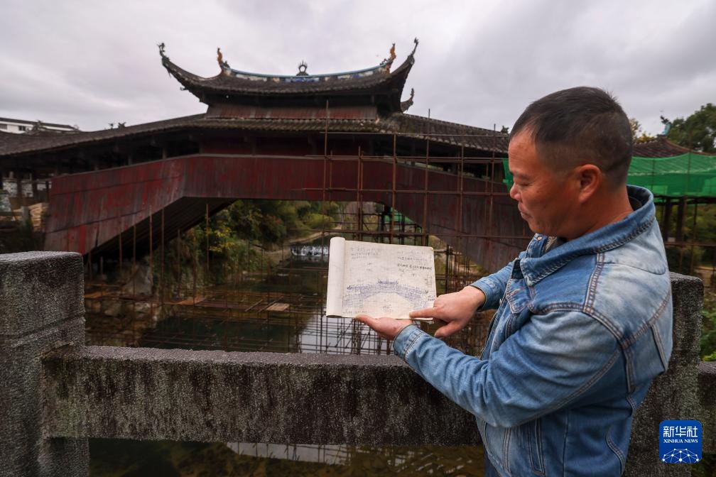 12月11日,木拱桥传统营造技艺省级代表性传承人曾家快在修缮中的泰顺县泗溪镇溪东桥前向记者展示自己二十多年前绘制的溪东桥结构图。
