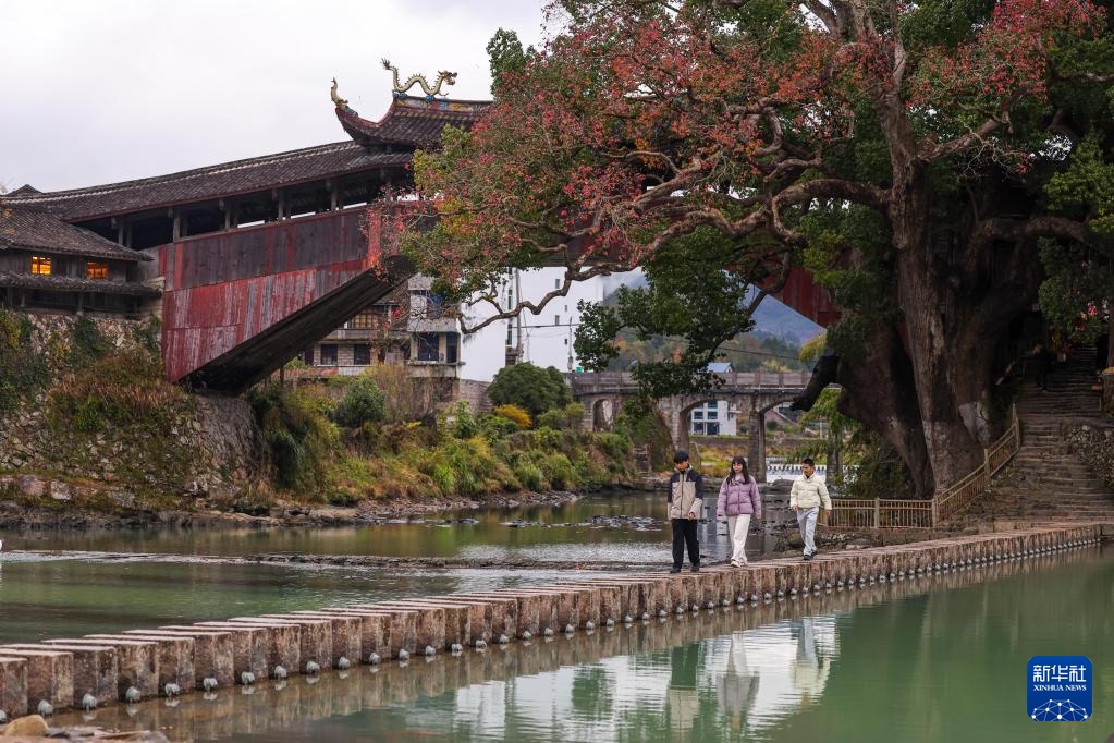 12月11日,游客行走在泰顺县泗溪镇北涧桥旁的碇步上。