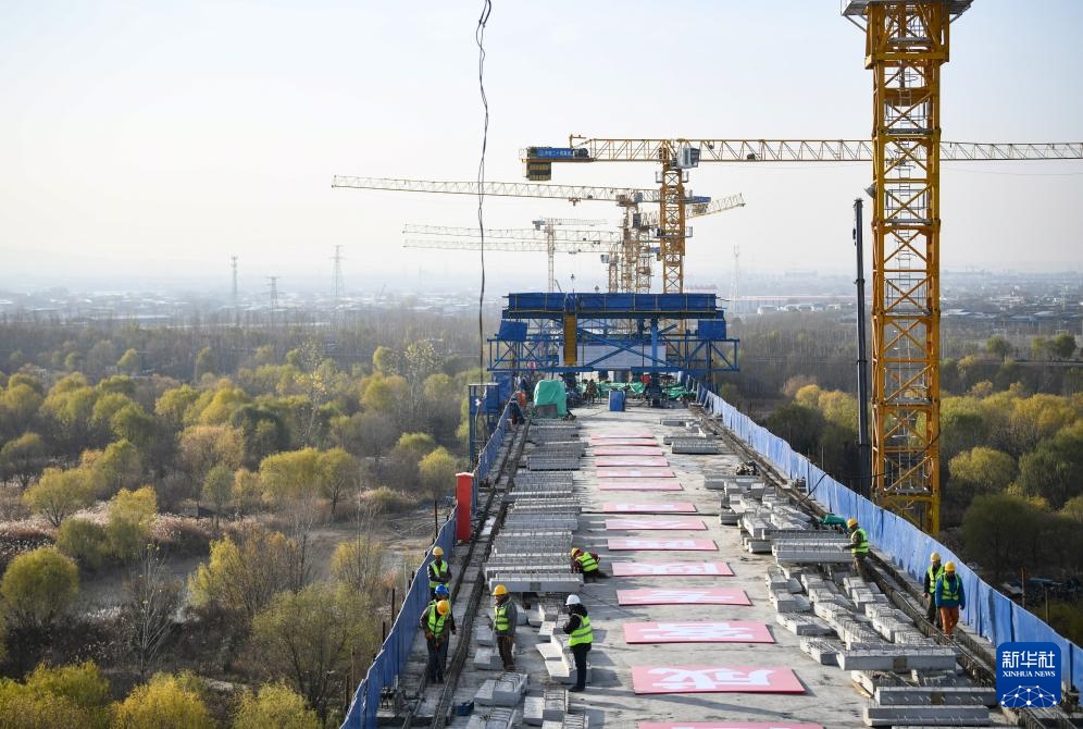 12月13日,中铁二十局工人在位于西安市的西延高铁渭河特大桥施工现场工作。