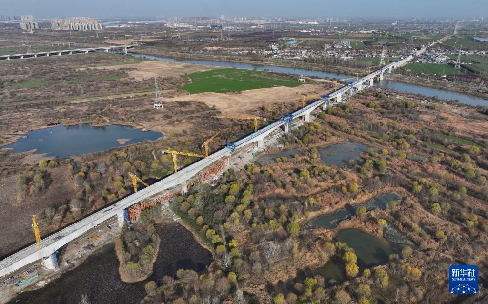12月13日拍摄的位于西安市的施工中的西延高铁渭河特大桥(无人机照片)。