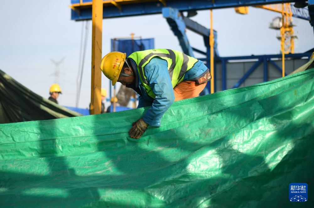 12月13日,中铁二十局工人在位于西安市的西延高铁渭河特大桥施工现场对合龙部分进行保温处理。