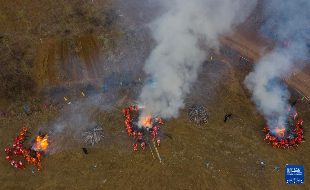12月13日,参加比武的灭火队员进行引水灭火项目的比拼(无人机照片)。