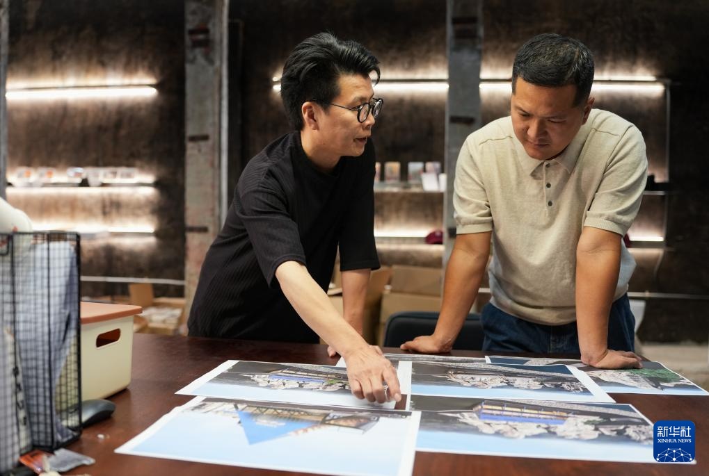 12月11日,刘德江(右)在位于汕尾市遮浪街道水龟寮村的办公室内和设计师探讨项目方案。