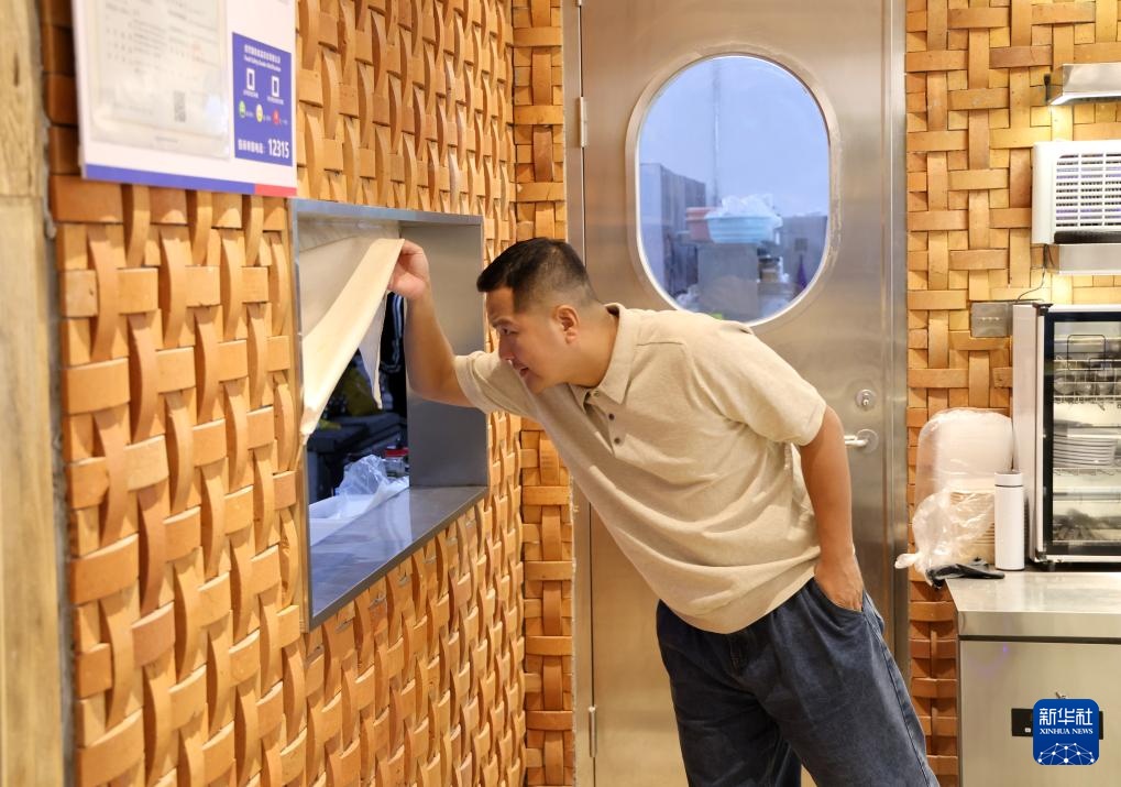 12月11日,刘德江在“浮日湾”咖啡馆查看厨房的情况。
