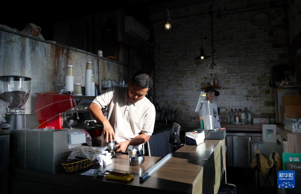 12月11日,刘德江在“浮日隐地”咖啡馆里做咖啡。