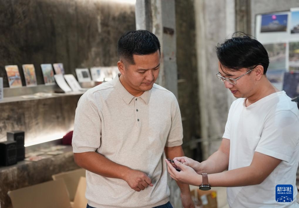 12月11日,刘德江(左)在位于汕尾市遮浪街道水龟寮村的办公室内向客人介绍他的公司开发的文创产品。