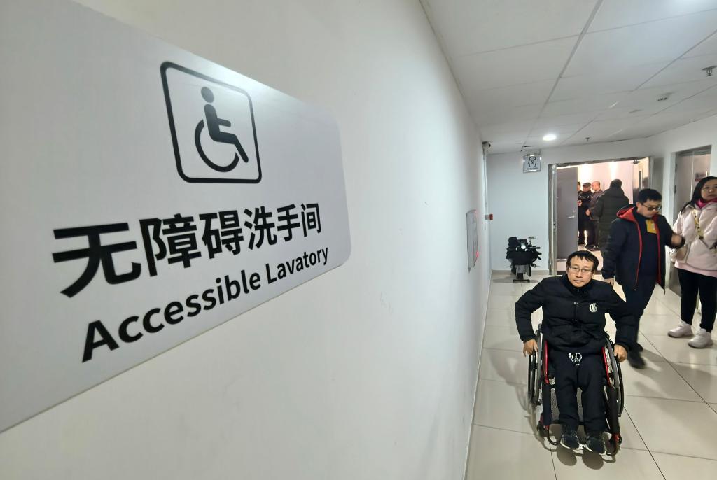 12月13日,残疾人代表体验商业大厦里的无障碍卫生设施。