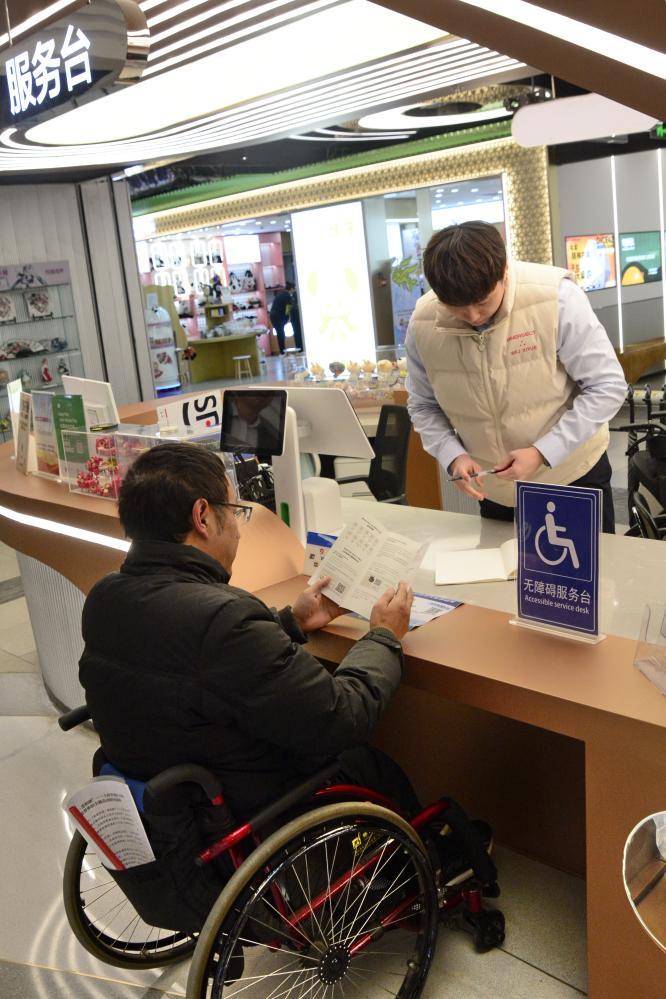 12月13日,残疾人代表体验商业大厦里的低位无障碍服务台。