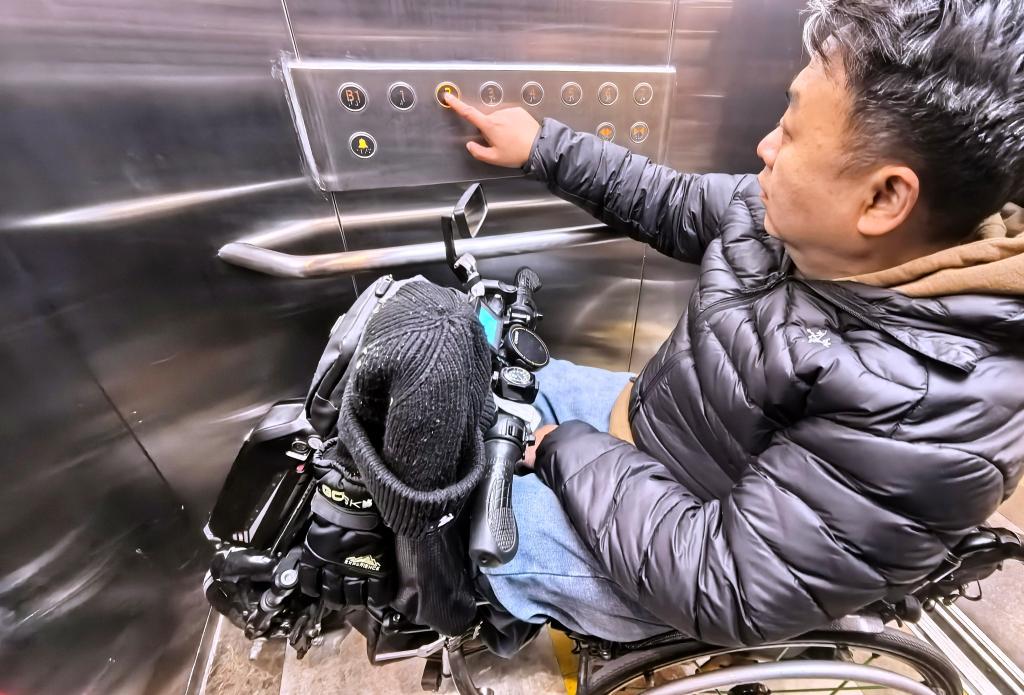 12月13日,残疾人代表体验商业大厦里的无障碍电梯。