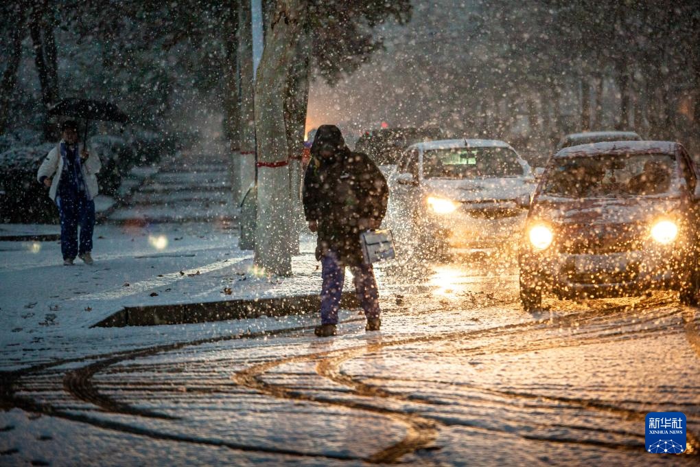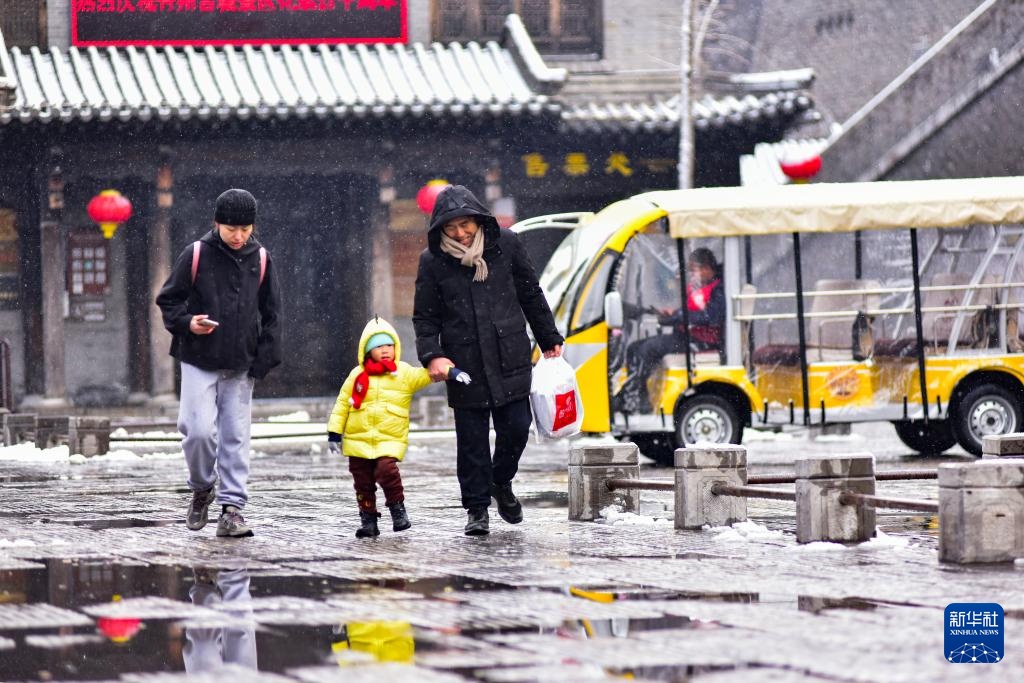 12月13日,在山东省淄博市高青县街头,行人冒雪出行。