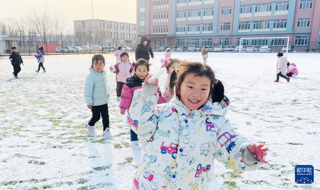 12月13日,在山东省滨州市阳信县金阳街道程坞幼儿园,小朋友在院子里玩雪。