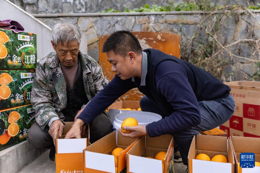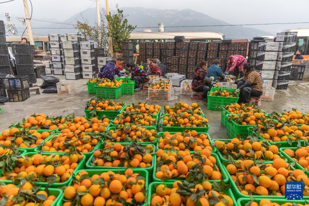 12月13日,在重庆市奉节县安坪镇三沱村,村民对奉节脐橙进行分拣装箱。