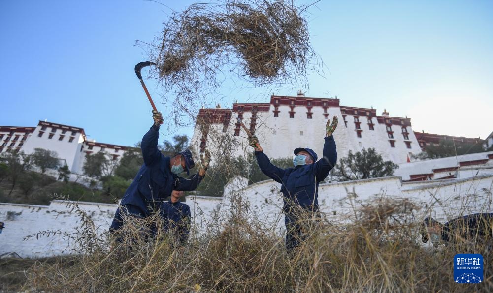 布宫消防救援大队队员在红山上除草,消除冬季布达拉宫火灾隐患(2019年11月6日摄)。