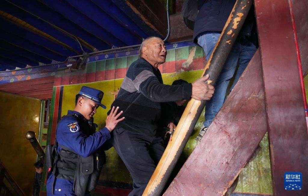 12月5日,布宫消防救援大队队员协助群众上楼梯。