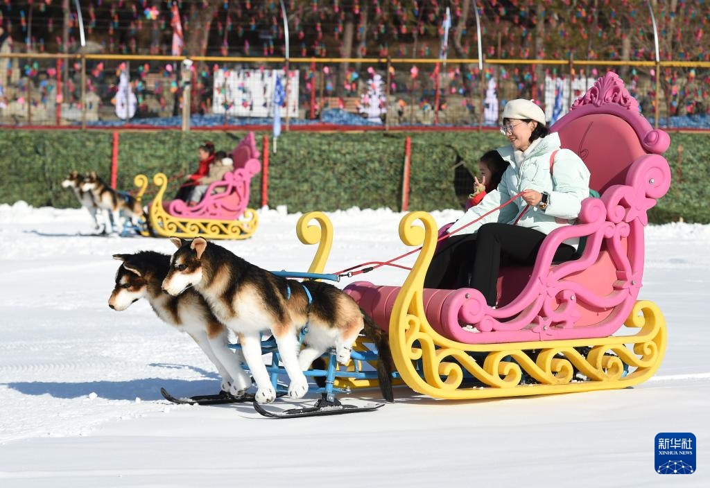 1月4日,游客在圆明园雪场内乘坐电动狗拉雪橇。