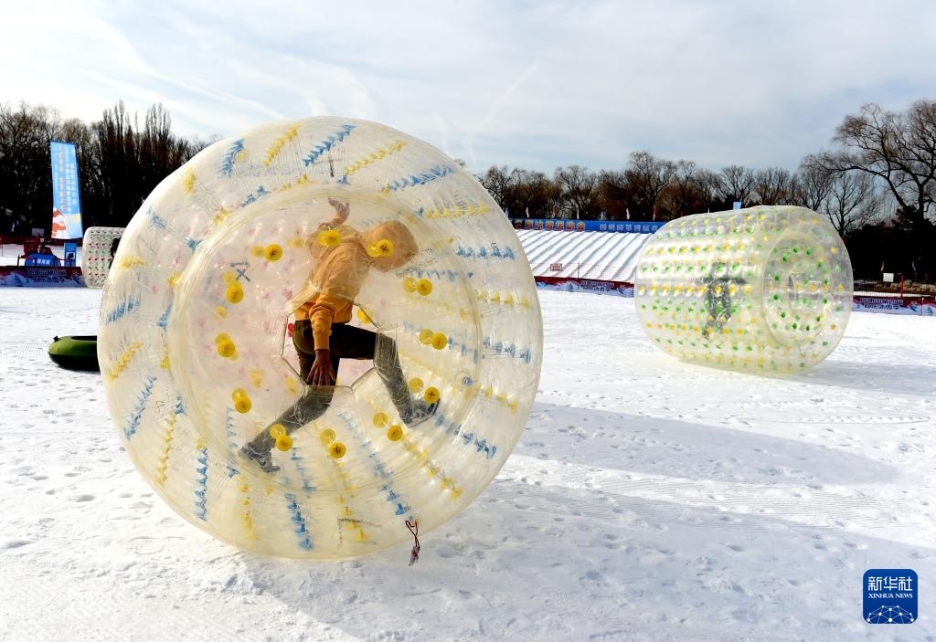 1月4日,游客在圆明园雪场内玩雪地悠波球。