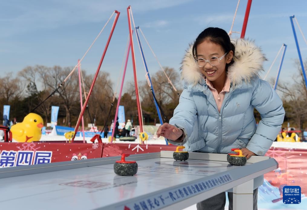 1月4日,一名小朋友在圆明园雪场内体验台式冰壶。