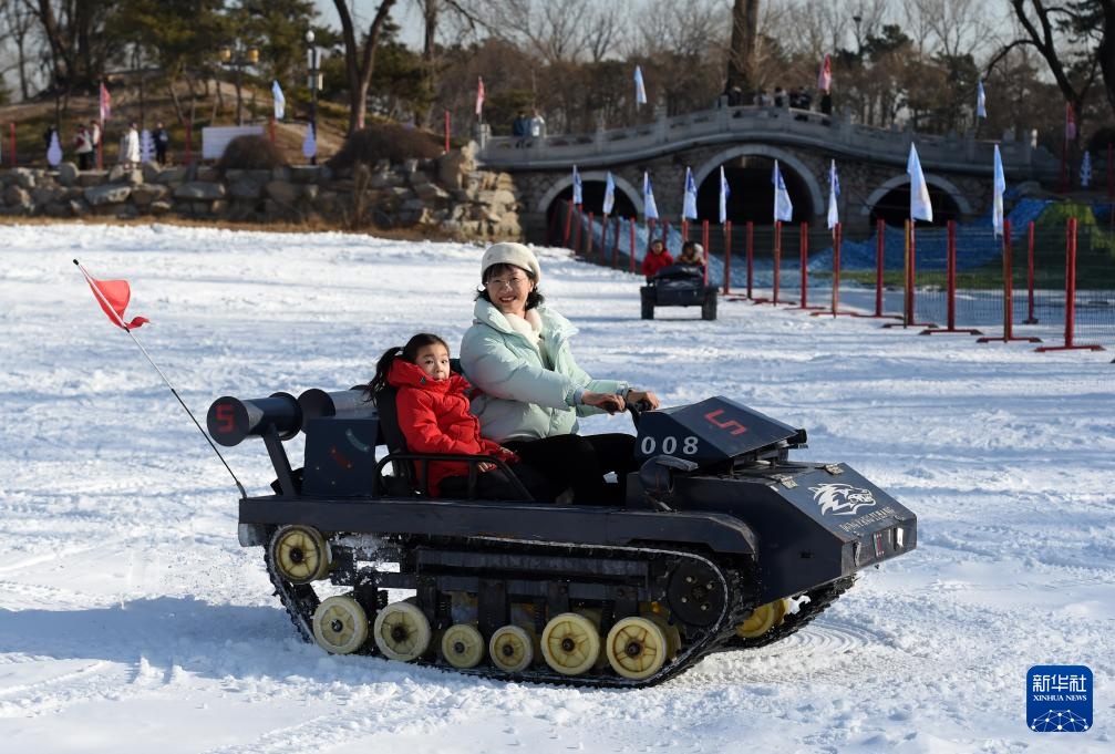 1月4日,游客在圆明园雪场内玩“雪地坦克”。