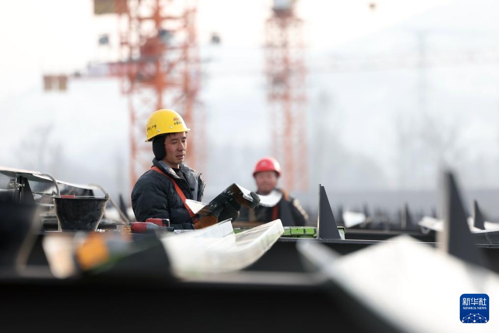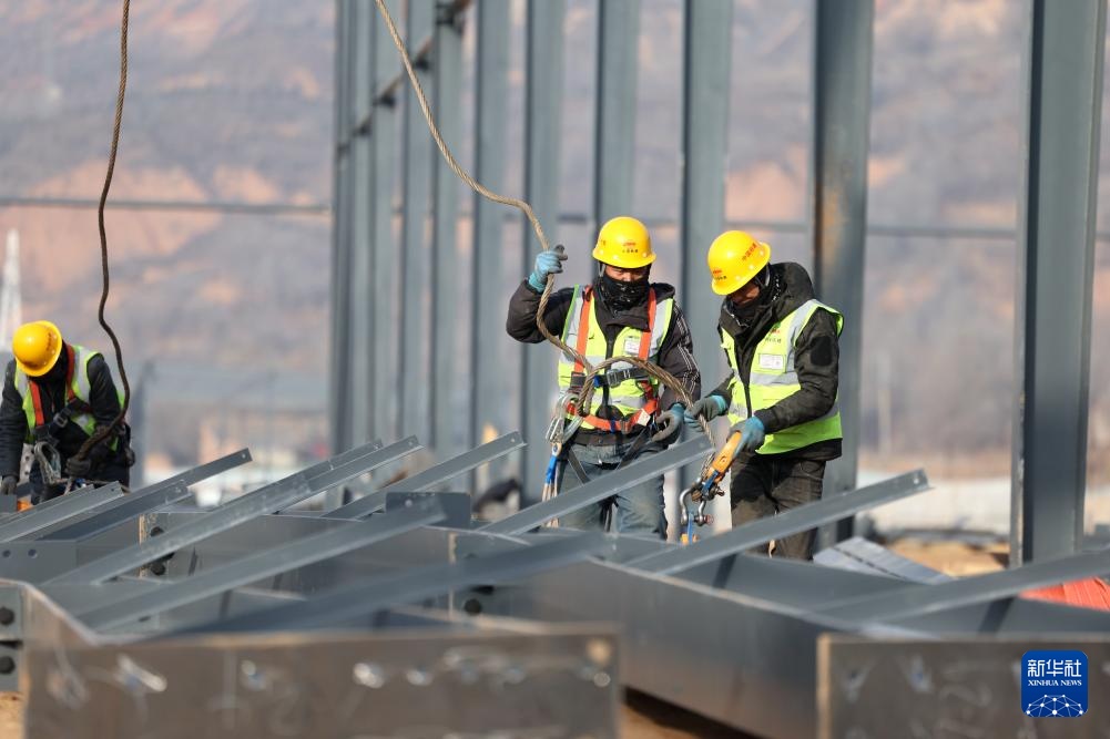 施工人员在中铁二十局承建的甘肃临夏综合物流园项目建设现场进行钢结构安装作业(1月6日摄)。