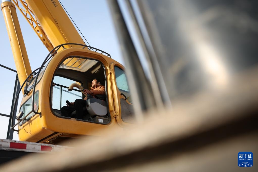 一位吊车司机在中铁二十局承建的甘肃临夏综合物流园项目建设现场进行起吊作业(1月6日摄)。