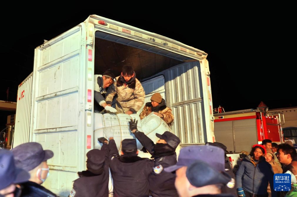 1月7日,救援人员在定日县措果乡装运救灾物资。