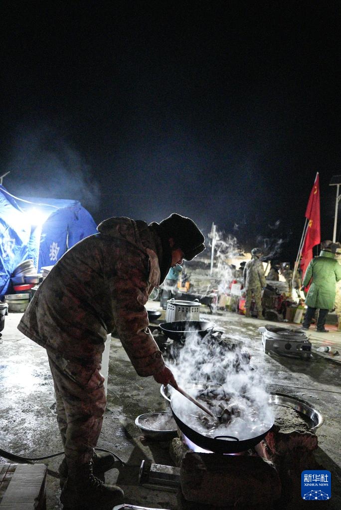 1月7日,在定日县古荣村集中安置点,解放军为受灾群众做饭。
