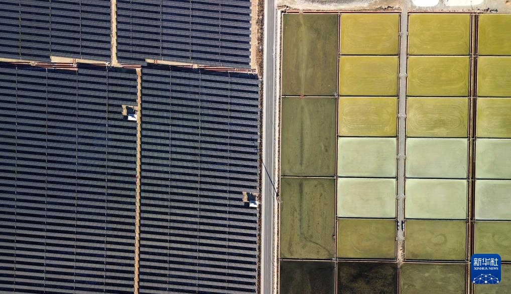 1月8日拍摄的位于山东省莱州市的中广核莱州土山600兆瓦盐光互补项目和附近的盐田(无人机照片)。